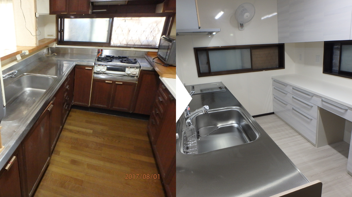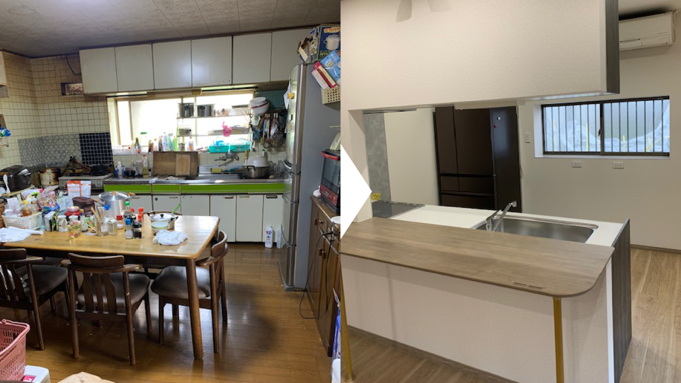 施工事例 3壁付けのI型キッチンを対面式に変更し、キッチンスペースが広くなり利便性が向上した。