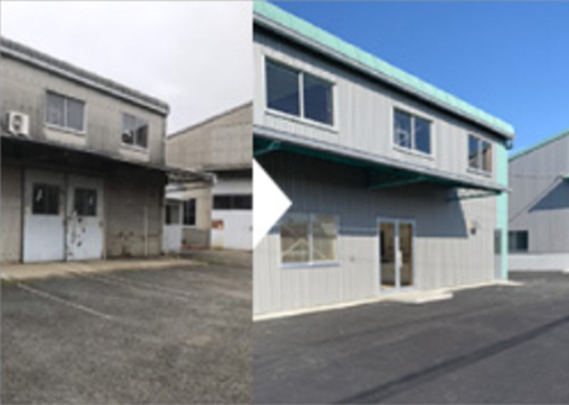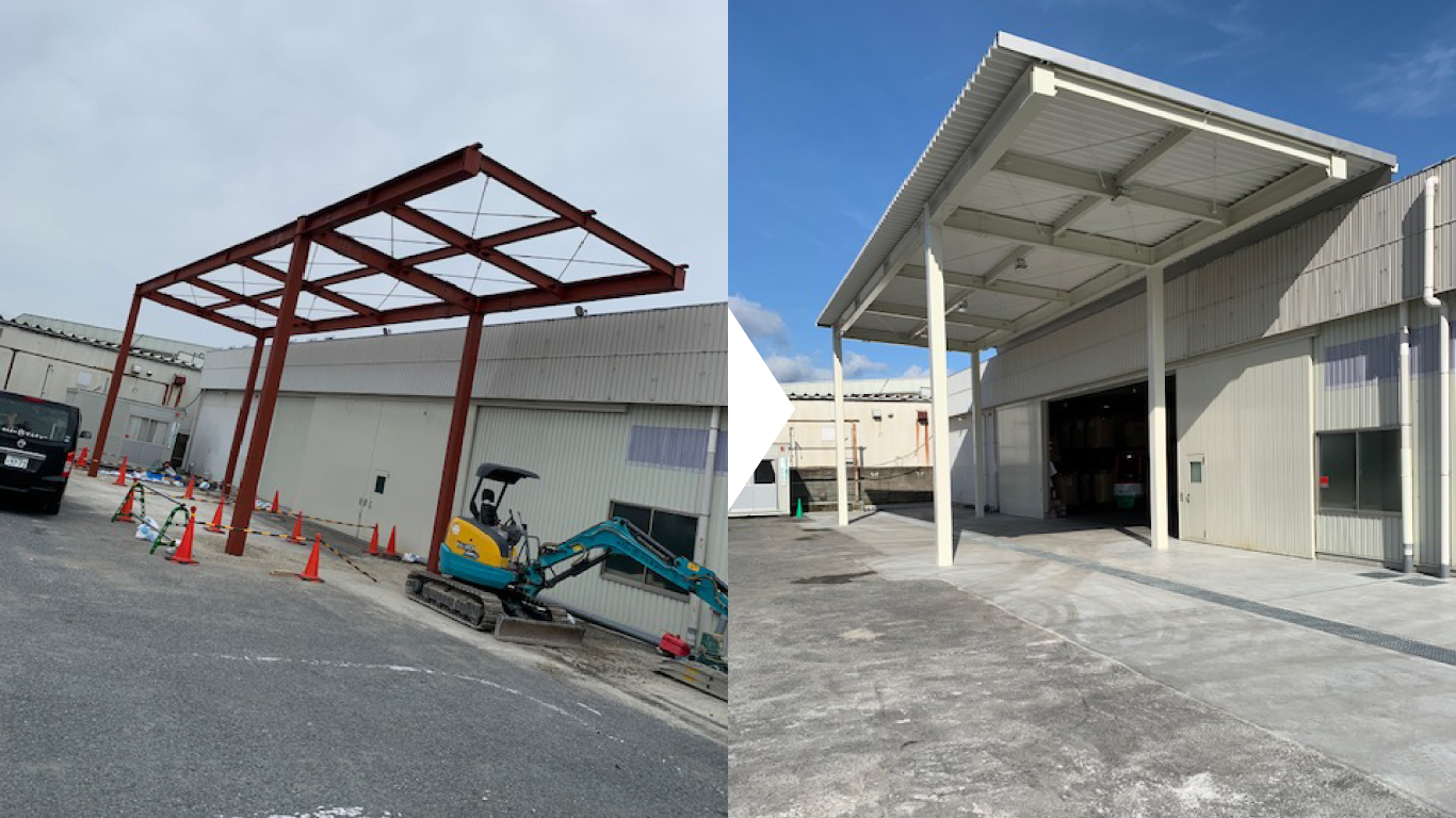施工事例 2雨の日、工場内に水が入ってきていたので溝を大きくし(VS側溝)、雨の日も外で荷受けが出来るよう庇を取り付けた。