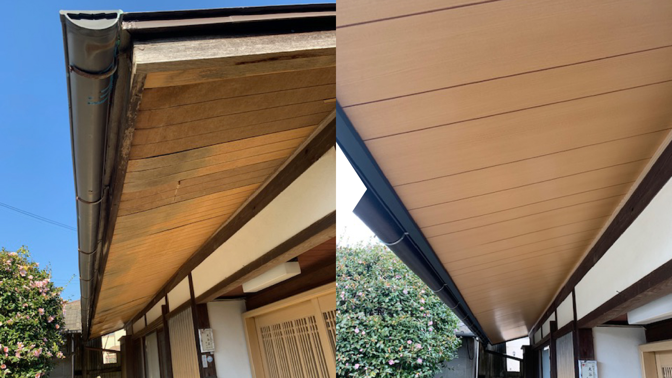 雨漏れで軒天が剥がれていたので、雨漏れを補修し張替をした。