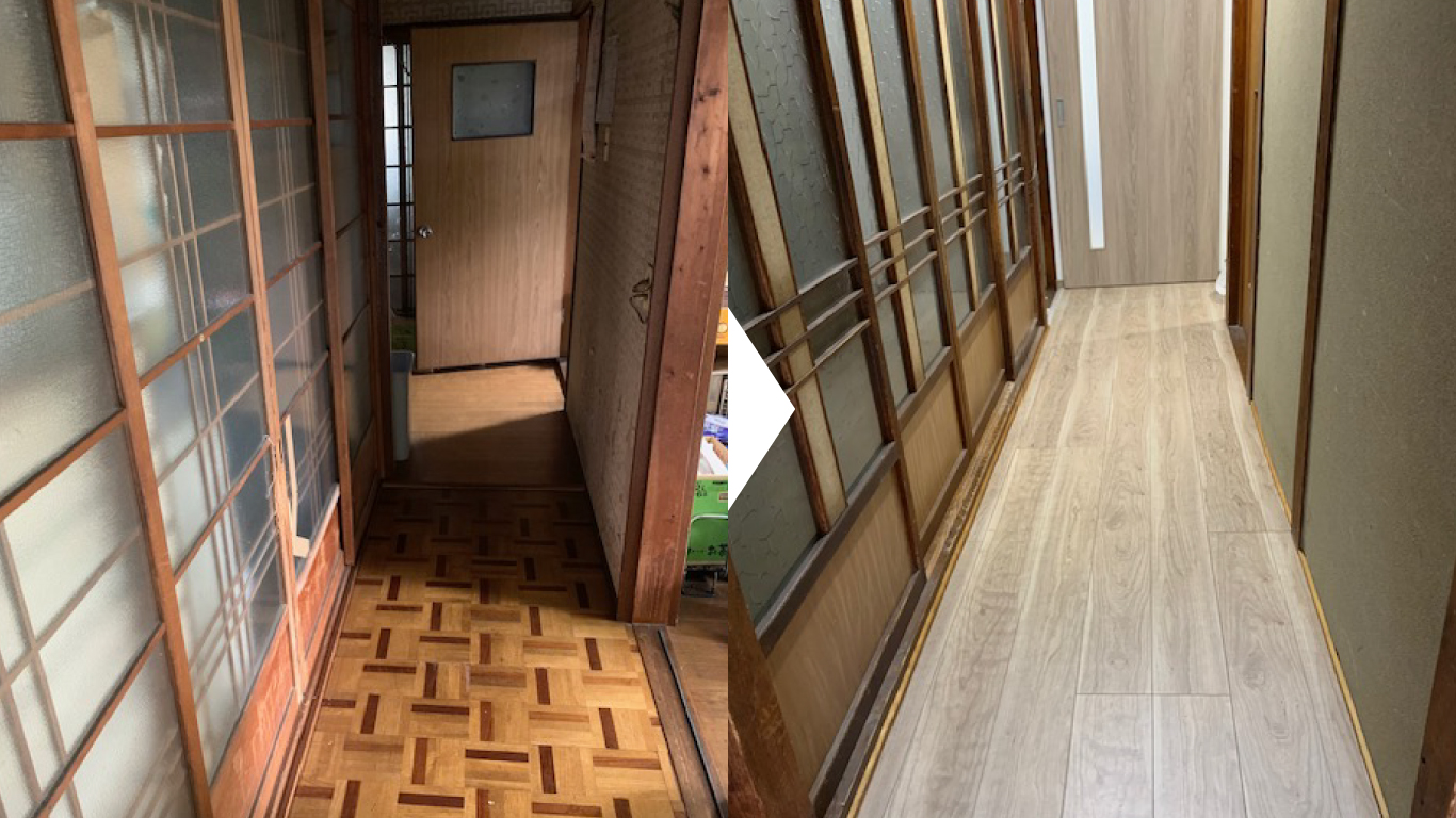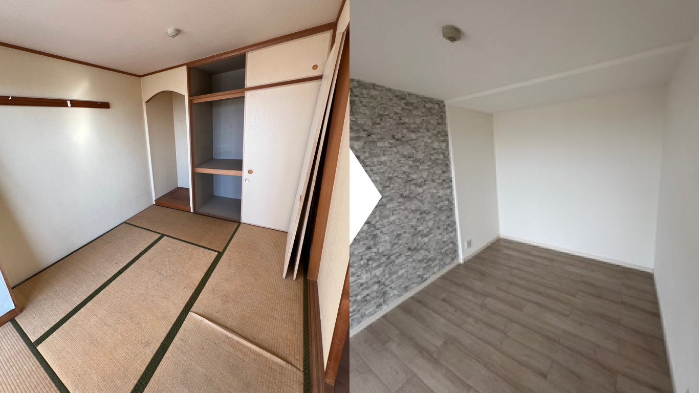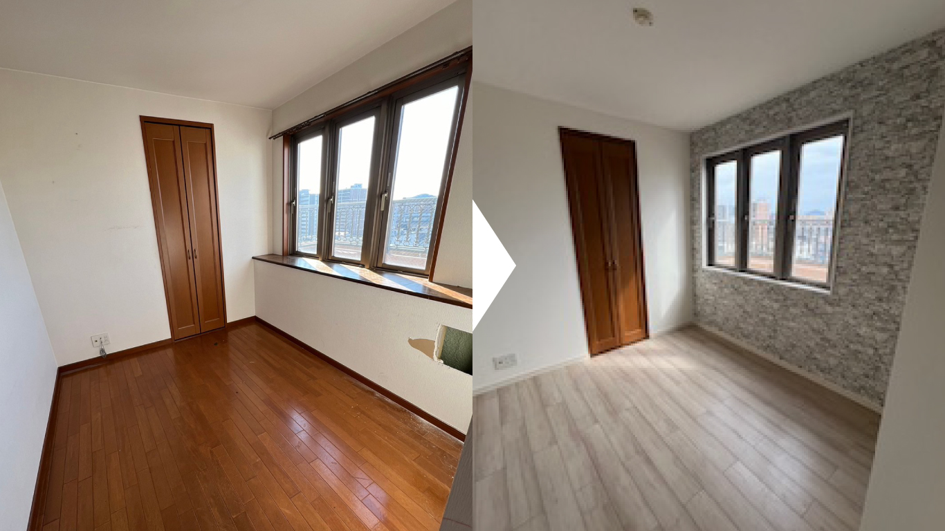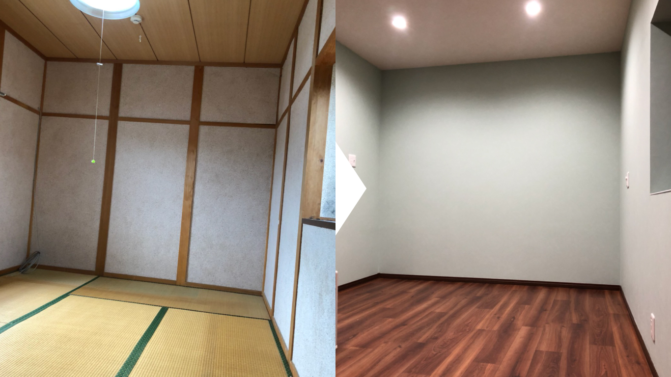 土壁がめくれ、すきま風も入り雰囲気が暗かったけど、洋室に一変し、断熱効果もあがり部屋の雰囲気も明るくなりました。